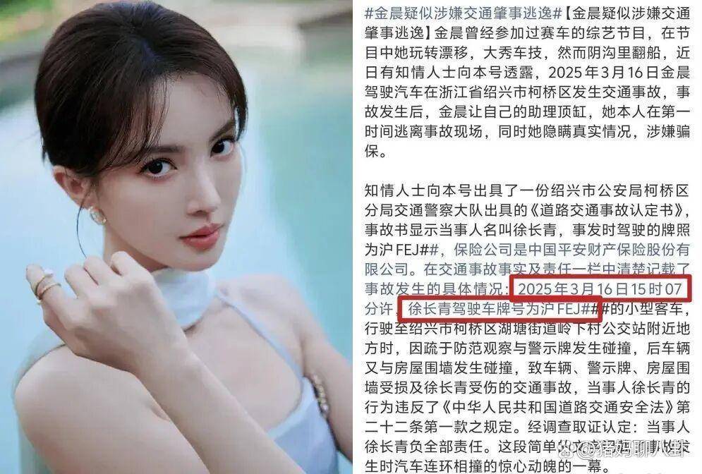 事情要追溯到 2025 年 3 月 16 日,那天金晨和两位朋友在浙江绍兴柯桥古镇玩得正嗨。下午三点左右,金晨开着沪 F 牌照的越野车返程,谁知一只狗狗突然窜上马路!紧急时刻,金晨猛打方向盘避险,车子却失控撞上路牌和围墙。车内三人都受了轻伤,最惨的是金晨——面部受伤流血不止!这画面想想都心疼,一张精致的小脸瞬间挂彩,换谁不慌?